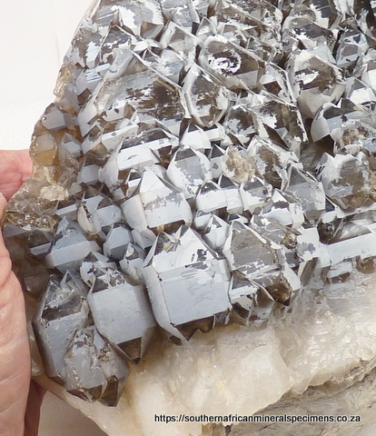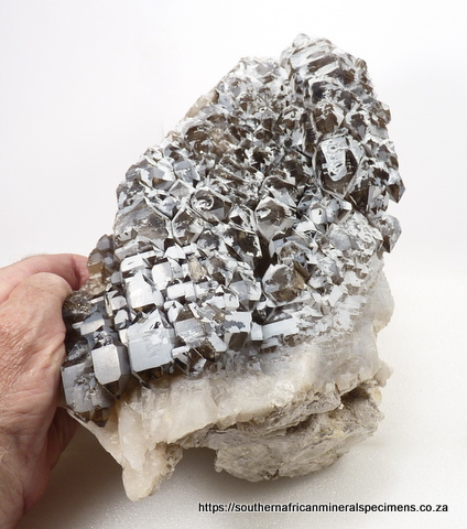 270 x 160 x 130 mm Description: A big specimen consisting of smoky cathedral quartz crystals with a partial coating of white quartz growth, sitting on a quartz matrix, with mica on the opposite side. The crystals have a few nicks and damage to the edges. Weight