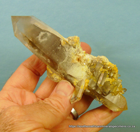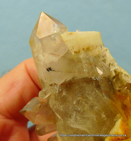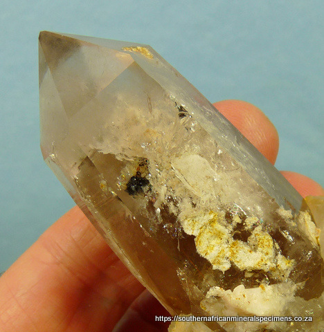 x 40 x 38 mm Description: A light smoky, double terminated quartz crystal with rutile and feldspar inclusions, and feldspar and dolomite (some in crystal form) on some surfaces. The termination points have no notable damage, whereas the rest of the specimen has a few small nicks and flaws (typical of specimens from this area). Weight