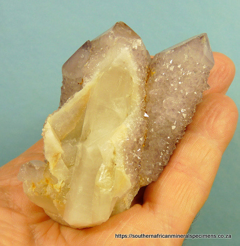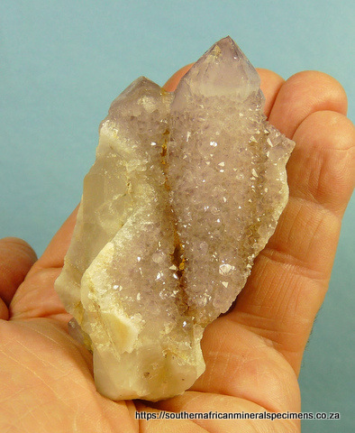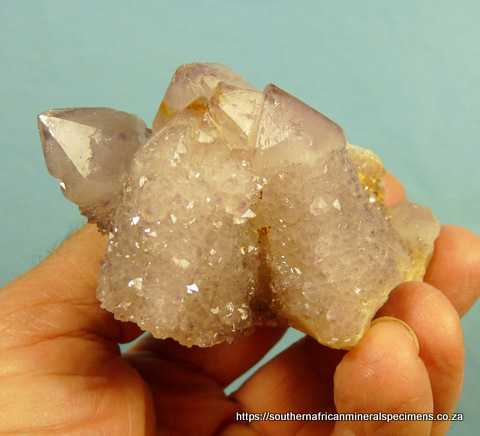 90 x 60 x 53 mm Description: A group of light amethyst cactus quartz crystals with one crystal of a 1st generation quartz growth, largely exposed. The terminations have a few small nicks, while the rest of the specimen has a few nicks. Weight