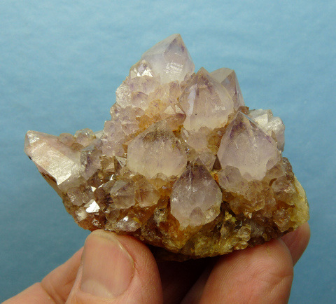 mm Description: A group of cactus quartz crystals with a faint amethyst colouring. Most terminations have only small nicks, while there are a few nicks to the rest of the crystals, and damage to its edges. The specimen has been trimmed at the bottom, to display better. Weight