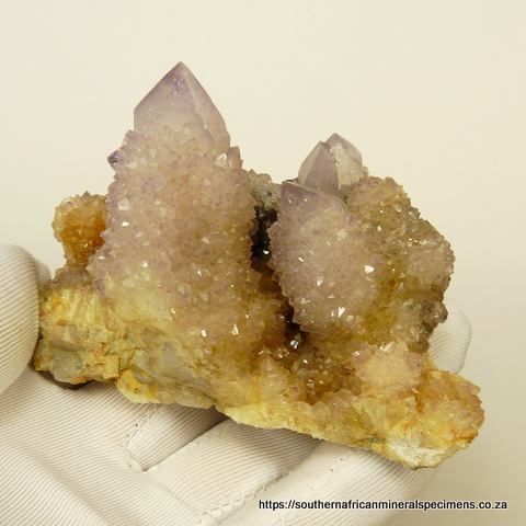 x 60 x 54 mm Description: A group of light amethyst cactus quartz crystals on (a trimmed) matrix. The terminations have a