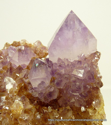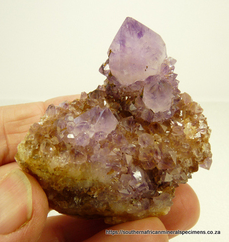 Description: A few semi-transparent amethyst quartz crystals share a quartz matrix with very small quartz crystals, which have a mainly light amethyst colouring. The main crystal (which grew horizontally) appears to be without any damage, while the other crystals have only the minutest of nicks. Some of the very small crystals have some damage. There are bits of stubborn clay attached to the specimen. On the side where the specimen parted from its greater matrix, there is a small, exposed geode. On that side of the specimen is a contact mark towards the back of the main crystal. Weight