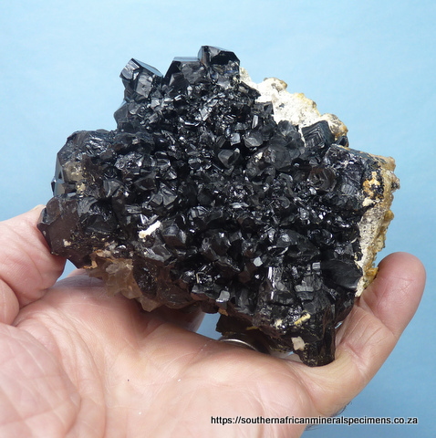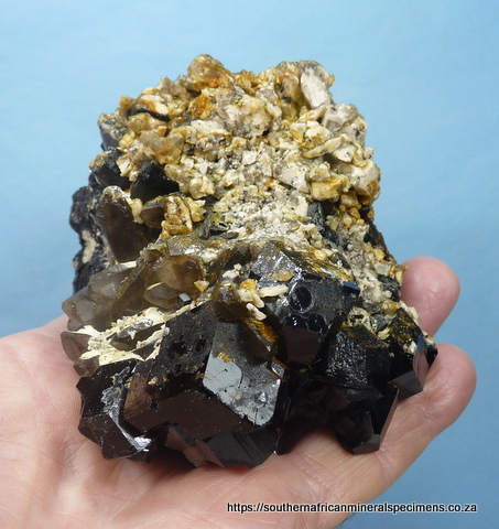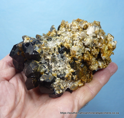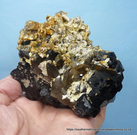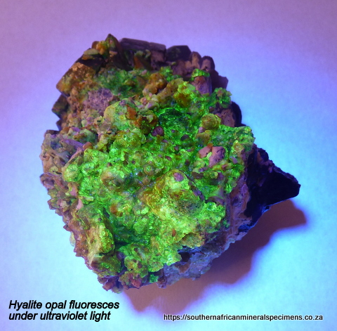 110 x 80 x 80 mm Description: A lovely specimen consisting of hyalite opal and feldspar sitting on schorl and smoky quartz crystals. The specimen fluoresces well under ultraviolet light. It has a few contact / pressure