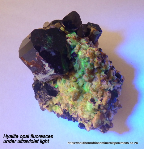 Measurements: 117 x 70 x 65 mm Description: Hyalite opal (which fluoresces under ultraviolet light) with bits of feldspar, sit on a schorl and smoky quartz specimen. The specimen has a few contact / pressure marks and nicks.Weight of Specimen: 388 g Chemical