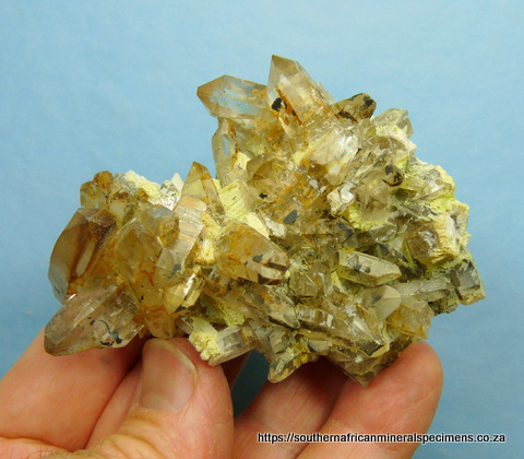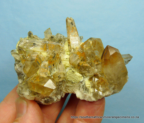 mm Description: A group of quartz crystals with bits of hematite and feldspar. The yellow mineral on the specimen is unknown to us. Some of the crystals have nicks. Weight