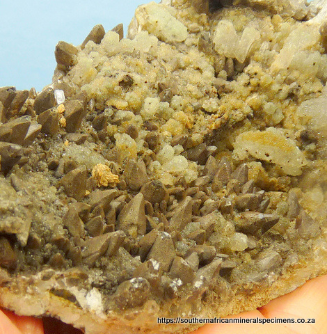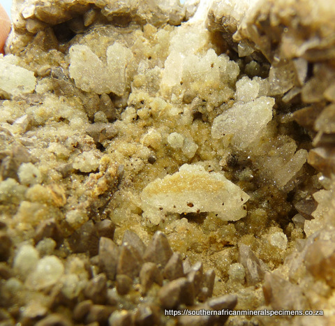 Measurements: 128 x 78 x 53 mm Description: A calcite geode with dogtooth calcite crystals and aggregates of chalcedony. When looking closely through good magnification, one can see a tinge of blue-green colouring in the chalcedony. This is one of only two specimens we have from a rare find, and we (and some of the Brandberg experts) haven't seen any other either. Some of the calcite crystals have nicks. Weight of Specimen: 316 g Chemical