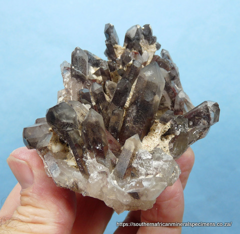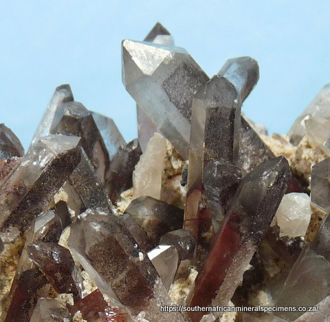 Measurements: 97 x 75 x 40 mm Description: A cluster of quartz crystals with hematite inclusions (some phantoms), sits on a quartz and feldspar matrix, with bits of feldspar among the crystals. Several crystals are damaged. The specimen displays well on a flat surface, all-round. Weight of Specimen: 230 g Chemical Composition: SiO2