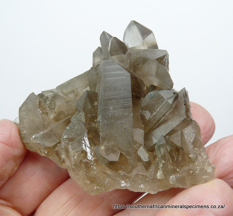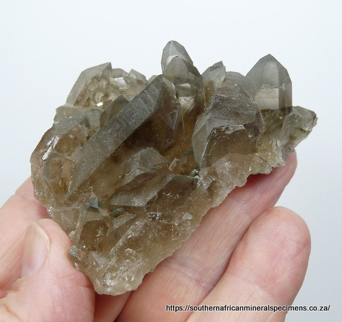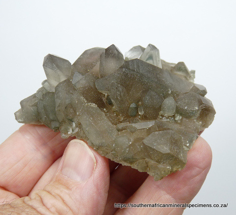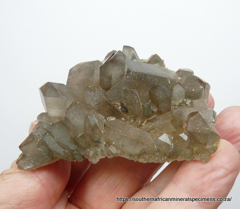 78 x 56 x 32 mm Description: A group of light smoky quartz crystals with bits of chlorite included. Some surfaces have a roughness to them, causing a somewhat dull appearrance, but one can see the good inner clarity via the other surfaces. One side of the specimen is damaged. Besides that, the specimen has very little damage - only a few small nicks to a few terminations and a few pressure marks. The specimen displays well on a