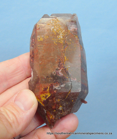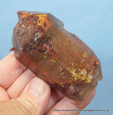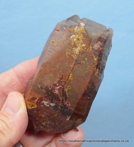 mm Description: A flattish smoky quartz crystal with one side having hematite inclusions. A few areas show exposed first generation quartz with its hematite coating, because the second generation quartz did not cover it completely. There is a neat pressure mark