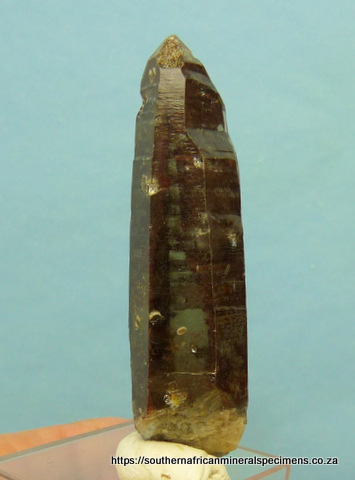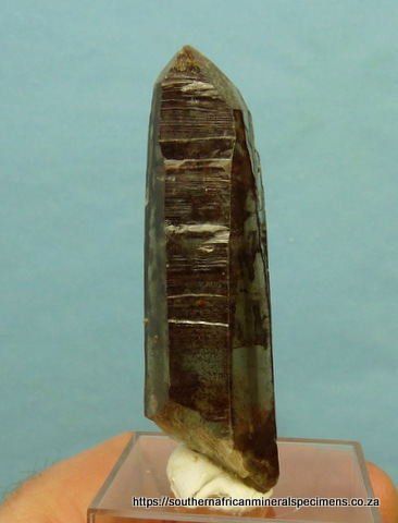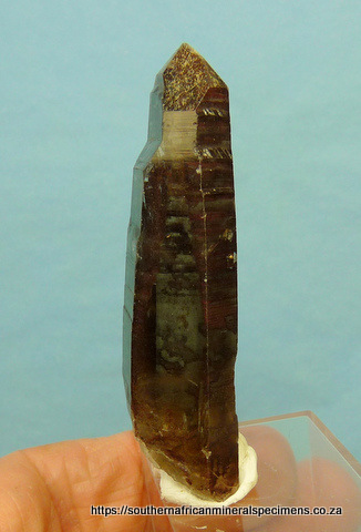 63 x 17 x 08 mm Description: A smoky quartz crystal with interesting inclusion patterns of hematite. There are small impressions on the crystal where small (unknown) crystals once sat, but then weathered away. The termination has a very