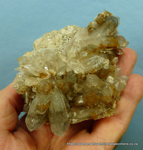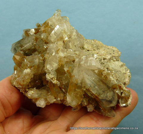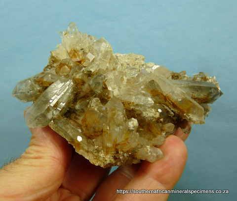 Measurements: 110 x 90 x 50 mm Description: A quartz crystal cluster with a mica-rich conglomorate rock matrix. A number of crystals have unusual phantoms, with yellow colouring (probably iron oxide stained chlorite) and bits of hematite. A