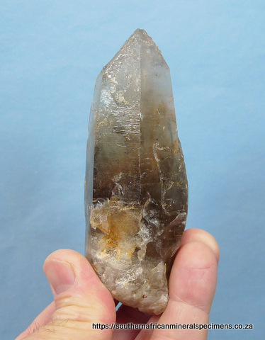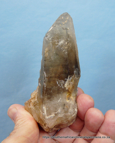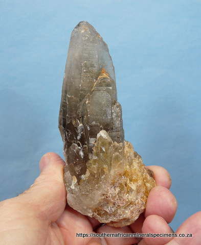 mm Description: A smoky quartz crystal with some parts having cathedral growth patterns. A few of the termination facets have interesting growth patterns, including triangles. The