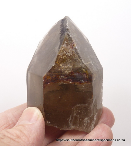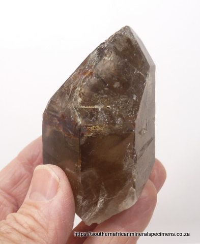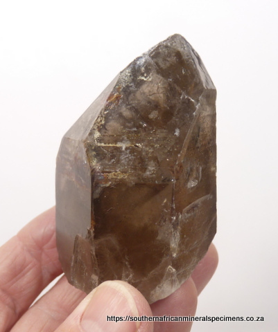 80 x 49 x 40 mm Description: A stubby smoky quartz crystal with two lovely phantoms. One can see some minerals that have been captured over the 2nd phantom, under a layer of clear quartz. On one of the facets are numerous minute quarts crystals and other bits of quartz deposited. The crystal displays well on a flat surface, at an angle. The specimen has a number of