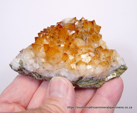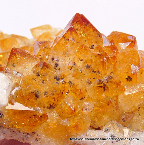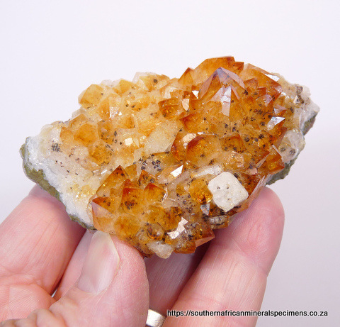 Measurements: 90 x 58 x 40 mm Description: Citrine quartz crystals with inclusions, that could be hematite, sit on a quartz / basalt matrix. The crystals were originally amethyst, but the specimen was then baked at a high temperature (roughly 400 degrees C) for about half a day, which turned the colour to citrine. The specimen has a few nicks. It displays well on a flat surface, all-round. The base of the matrix has been trimmed. Weight of Specimen: 172 g Chemical Composition: SiO2 (quartz) Hardness on Mohs Scale: (quartz) 7 Location: Minas Gerais, Brazil. Specimen