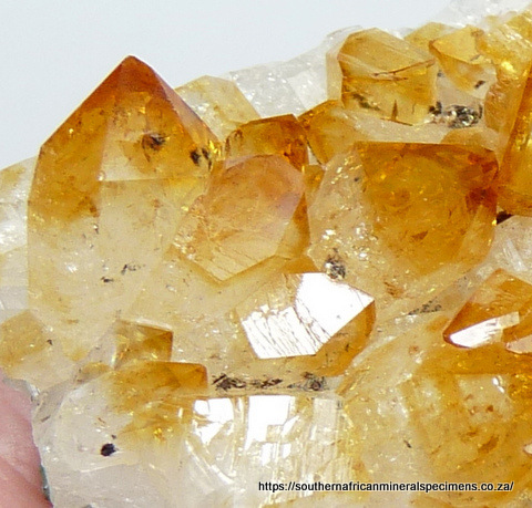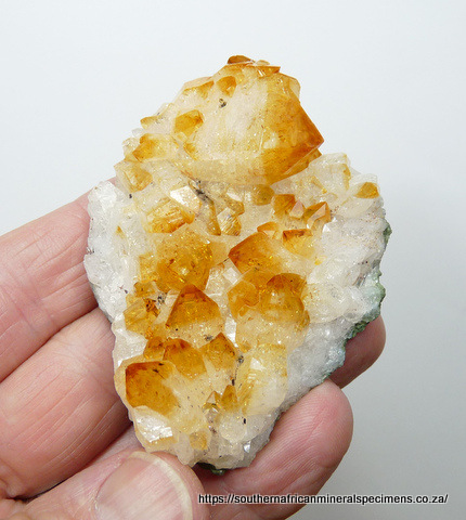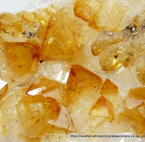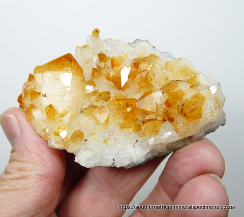 78 x 53 x 22 mm Description: Beautiful citrine quartz crystals sit on a thin basalt matrix. The crystals were originally amethyst, but the specimen was then baked at a high temperature (roughly 400 degrees C) for about half a day, which turned the colour to citrine. The only notable damage is to the edges of the specimen. Weight