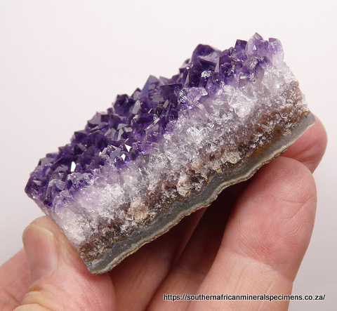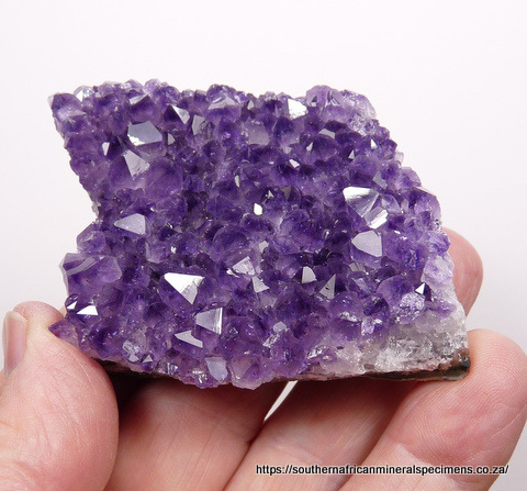 Measurements: 62 x 56 x 23 mm Description: Drusy amethyst quartz crystals with lovely colouring, osit on a quartz and chalcedony matrix. The only notable damage is to the edges of the specimen.When displaying your amethyst specimens, keep in mind that the colour tends to fade when exposed to sunlight. Weight
