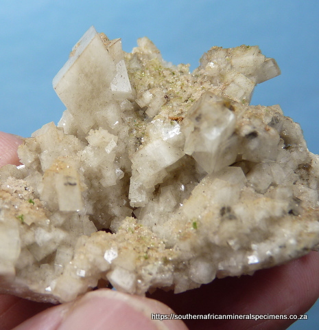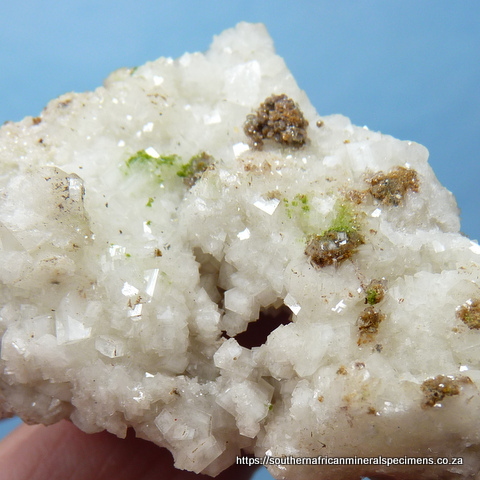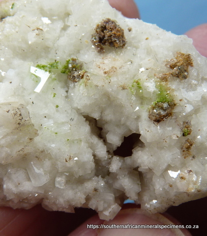 mm Description: A two-sided specimen of calcite crystals with bits of duftite and a brown mineral, unknown to us. When turned in light, the shiny surfaces of the calcite crystals can be better appreciated. The specimen