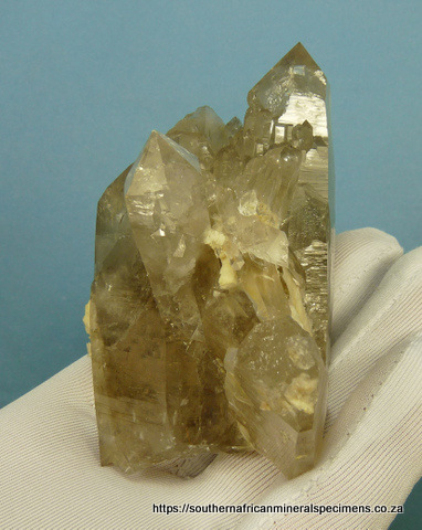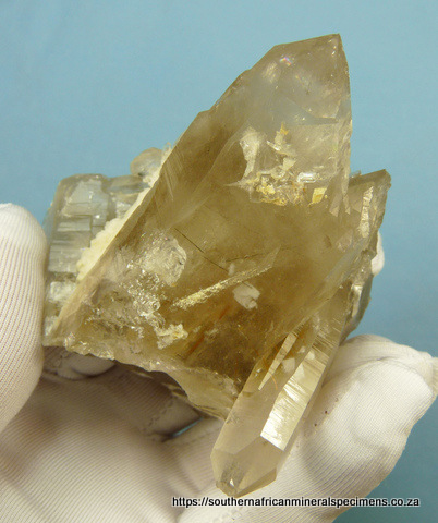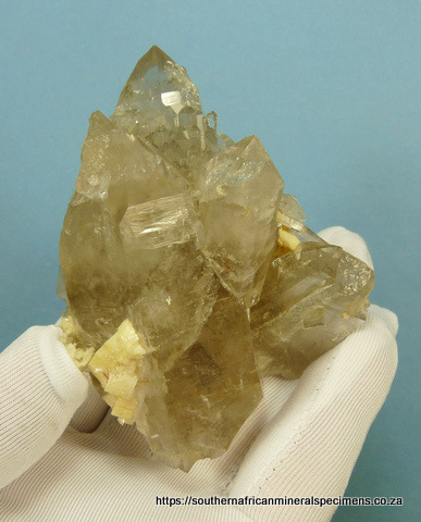 90 x 76 x 70 mm Description: A group of light smoky quartz crystals with orthoclase feldspar and a few rutile needle inclusions. The specimen has a few nicks, flaws and contact marks. Weight