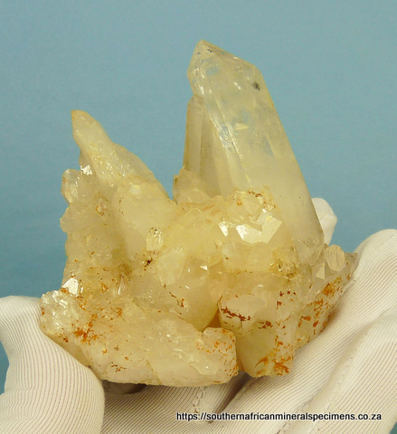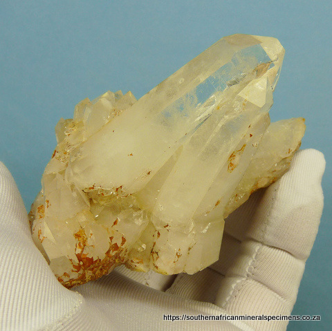 84 x 78 x 53 mm Description: A group of quartz crystals with the largest crystal being double terminated. The specimen has bits of goethite on it, and it also covers a large part of its bottom. It is one of those instances where photographs don't do justice to the subject. When looking at it through a loupe or merely tilting it in light, one sees the multiple terminations and facets of varying sizes. The specimen, which was part of