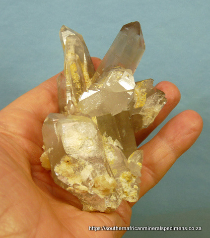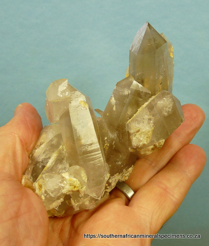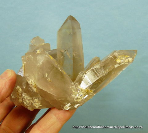 Measurements: 127 x 70 x 63 mm Description: A cluster of light smoky quartz crystals, with most having phantoms, some of which are partially exposed. There are bits of feldspar attached. The termination points have only minute nicks, with the rest of the specimen has a few nicks and flaws, typical of specimens from this area. We add an extra (double terminated) crystal to it (image top right), which was part of the original specimen, but came loose after we'd mined it. Weight