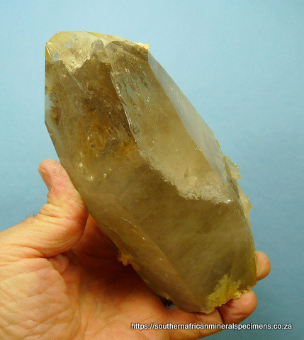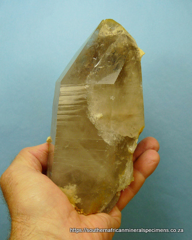 Measurements: 170 x 80 x 60 mm Description: A large, light smoky quartz crystal with quite a few rutile inclusions, as well as feldspar captured under the quartz, and on the crystal. The termination point has a few small nicks, while the crystal has a few flaws (typical of specimens from this area) and contact marks near its base. Weight