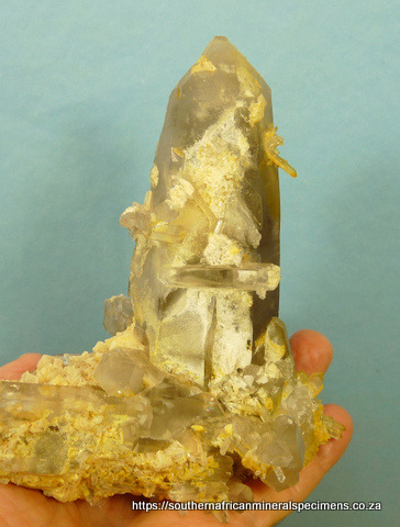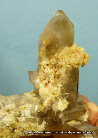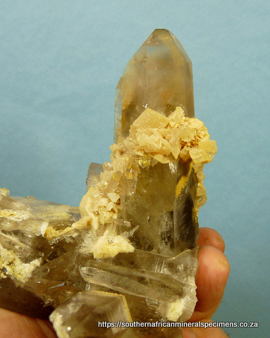 Measurements: 148 x 140 x 115 mm Description: A group of light smoky quartz crystals with dolomite crystals and feldspar crystals inside and on some surfaces. One large crystal termination has only very small nicks, while the other two crystals have pressure marks. The specimen has a few flaws, typical of specimens from this area. Weight