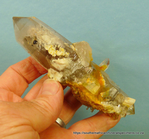 x 40 x 38 mm Description: A light smoky, double terminated quartz crystal with rutile and feldspar inclusions, and feldspar and dolomite (some in crystal form) on some surfaces. The termination points have no notable damage, whereas the rest of the specimen has a few small nicks and flaws (typical of specimens from this area). Weight
