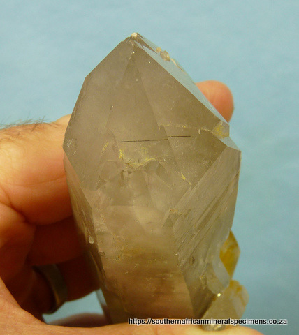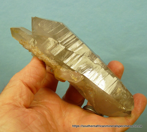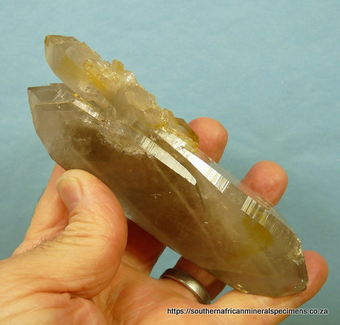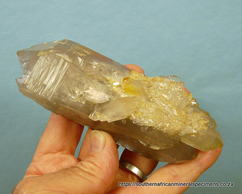 x 55 x 40 mm Description: A light smoky, double / multi-terminated quartz specimen with a lovely plate of smaller quartz crystals on its surface, and a few rutile inclusions. The specimen has only a few nicks. Weight