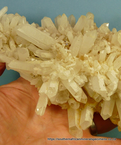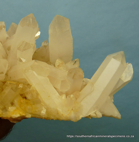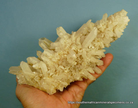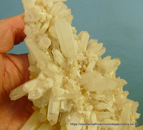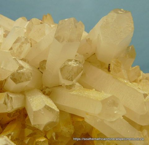 x 105 x 103 mm Description: A beautiful specimen consisting of mostly clear quartz crystals that have an outer layer with a sandblasted appearrance, on most shafts. The termination points are clear, so one can see the clear cores inside. We are not aware of any other location where similar specimens have ever been mined. The